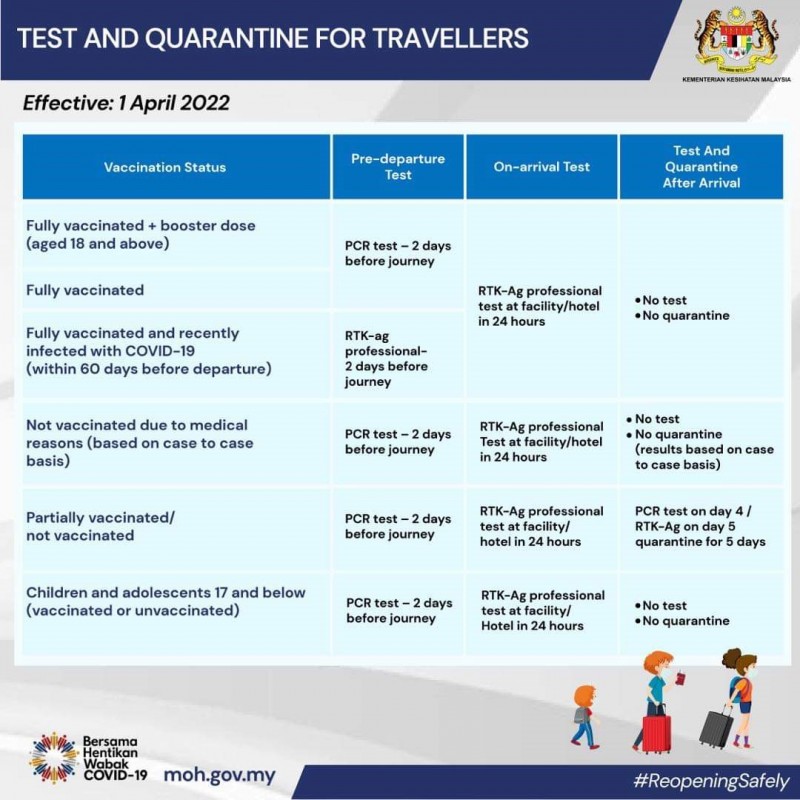 In the endemic phase, fully vaccinated international visitors, as well as citizens returning to Malaysia, will not be required to undergo quarantine upon arrival. They will be required, however, to undergo a RT-PCR test two days before departure and a rapid test upon arrival.